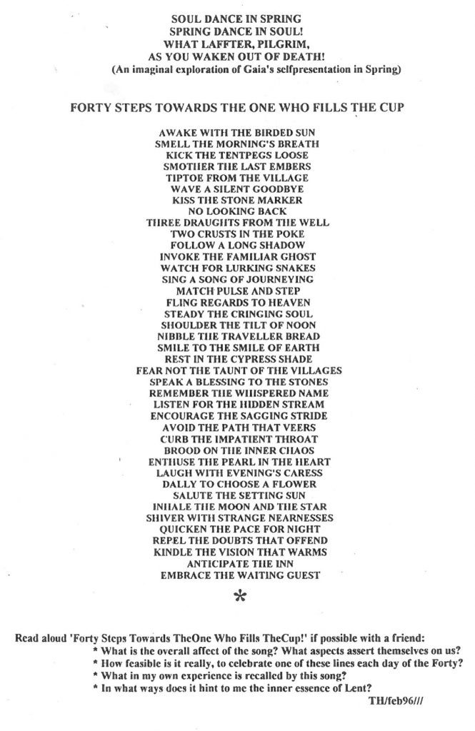 As background to why and how it has become a treasure in my life, we got it first in ADBI for Lent 1995. Maybe it was because I was settling into a ‘new life’ having ‘crossed over’ from Togher (southside) to The Glen (northside) in 1994 and I badly needed a guide, a map, an image for this new journey to what has turned out to be ‘the rest of my life’. So I learned it off bit by bit, using the days and weeks of Lent for each line, four from Ash Wednesday to the following Saturday, then 6 days Mon/Sat for 6 weeks – Sunday being the rest day. The rhythm of each line has a walking beat, and the image in each line expresses the journey.