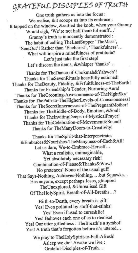 Mindful of Tom’s complete avoidance of what he calls the “usual guff,” couched, or indeed smothered, in theological or more churchy jargon, I am half afraid to offer some reflections on this deep and powerful poem. The title obviously offers us a key to the central themes of the poem namely gratitude, discipleship and truth, themes that are inextricably linked in themselves.