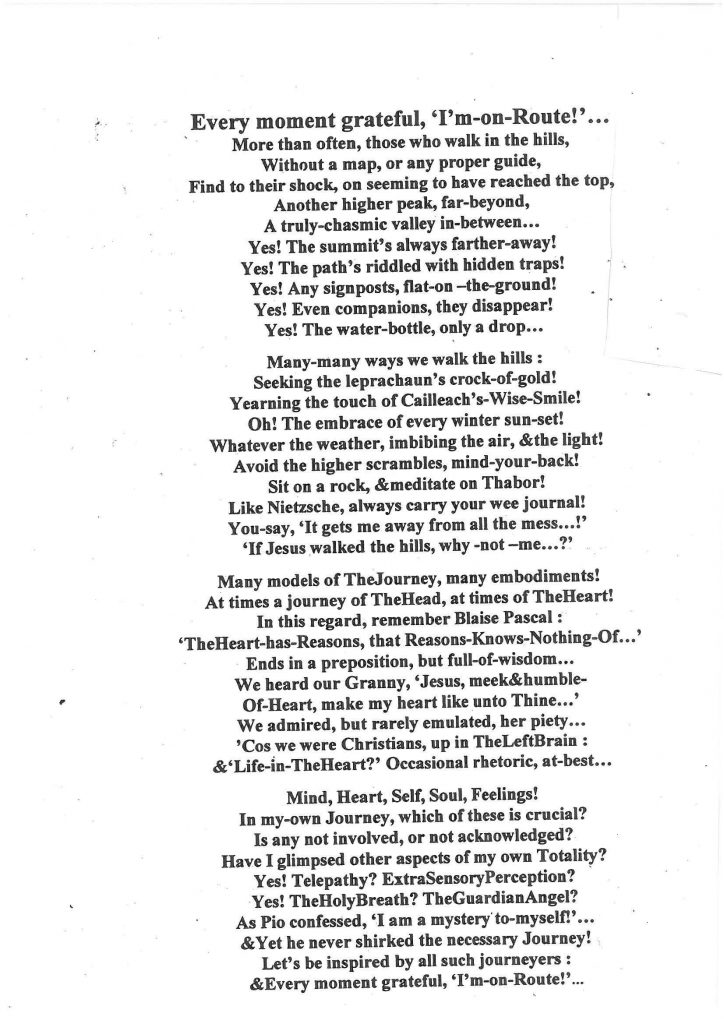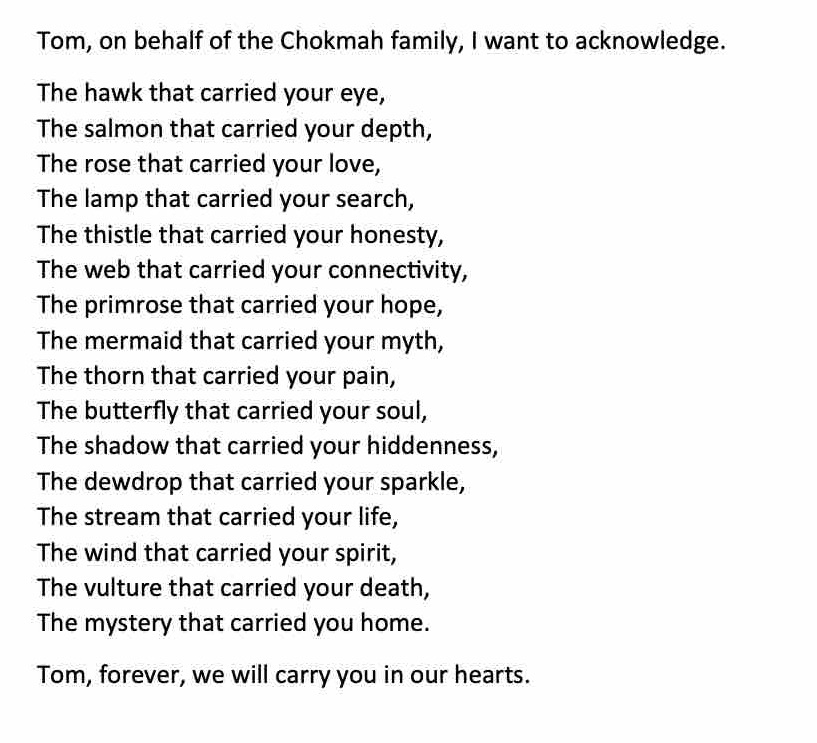 Friday 2nd October 6.20am 2020 Feast of the Guardian Angels The full moon reigned luminously In a sky adorned by shapely windblown clouds, Windswept skeletons of trees, Swayed dancer-like as loyal witnesses organised themselves, To gather, to celebrate and to give thanks, for, Our priest, and our brother, our mentor and our healer, Our dear friend Tom. Thus began the day chosen to mark Tom’s passing from A co-vid stricken world to the glory of The Eternal Father, Jesus our Saviour, his blessed Spirit, the Mother Mary And the entire Body of Christ, the ever expanding and new Kingdom of God. Greetings to all who will assemble in body and spirit from 3 – 3.45pm. At that time, this Autumn Workshop of the Chokmah Committee Will bear their first fruits in thanksgiving. Amen a Thiarna Dia. Sending peace, love and blessings. Mairéad Ní Dhubhghaill