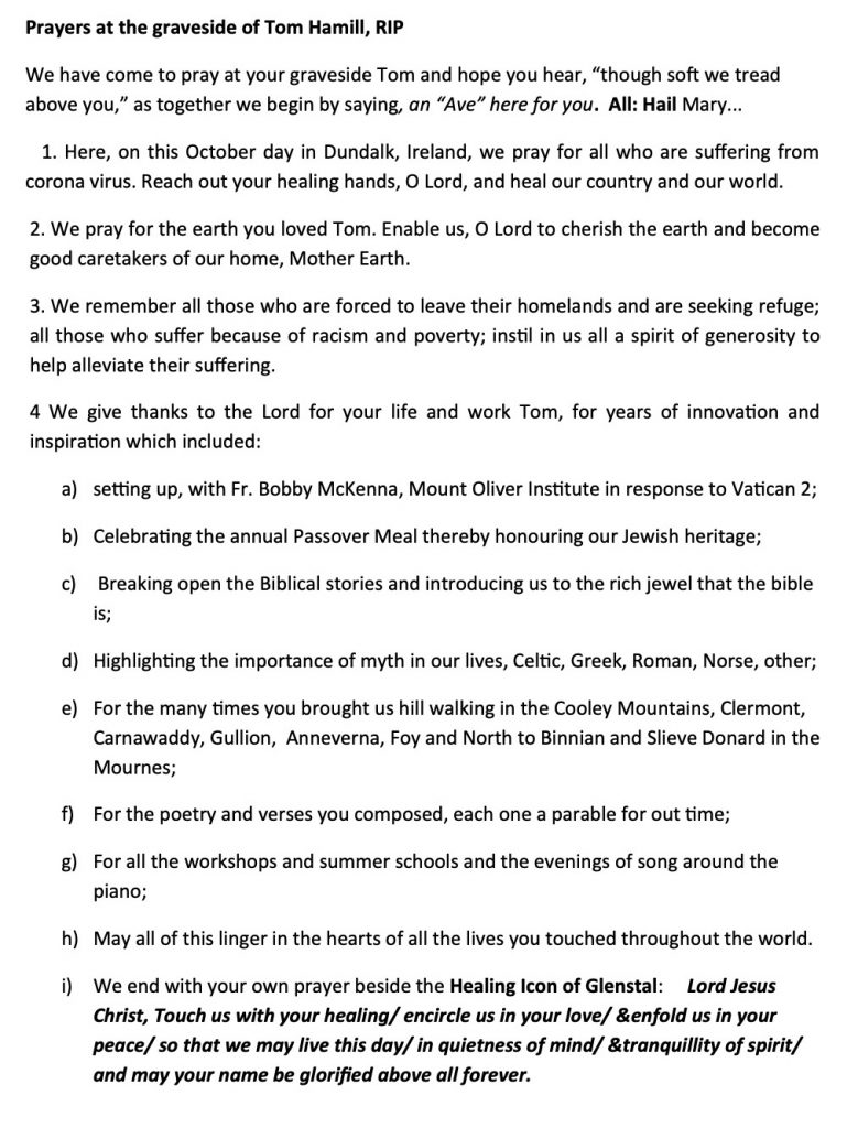 A ritual of remembrance and thanksgiving for the life of Fr. Tom Hamill was held around his grave on Friday October 2nd 2020. Due to the pandemic situation, the group was limited to the Chokmah committee with music provided by Yvonne Donnelly.